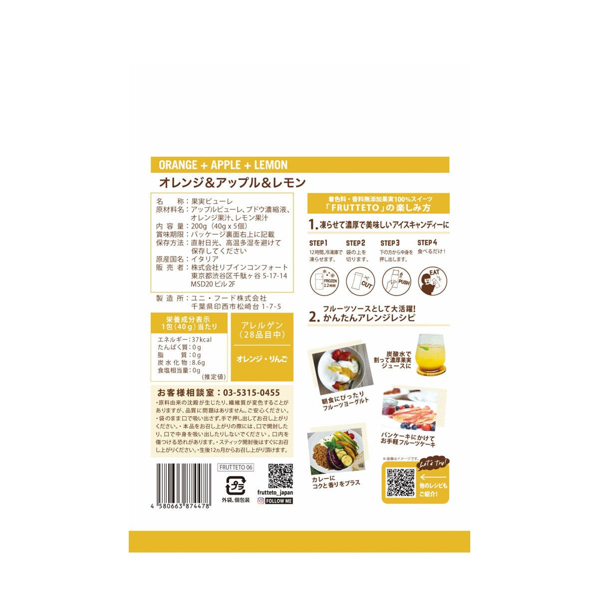 商品名:Frutteto(フルッテート)オレンジ&アップル&レモン 40g×5個入